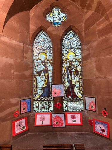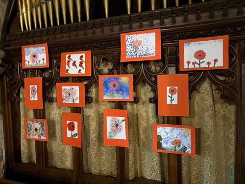 The children have worked with great care and creativity to make stunning poppy-themed art for Remembrance Day. Their artwork now decorates the Church.